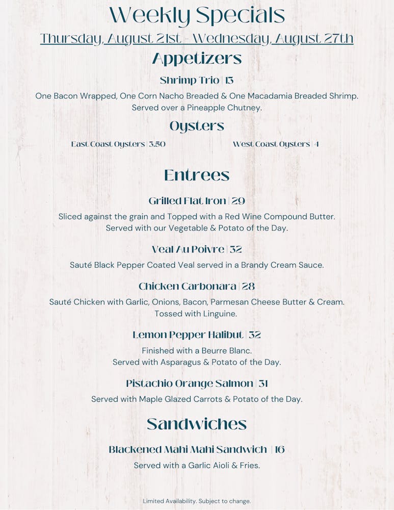 Burgers, Salmon BLT's and Chicken Roma Sandwiches